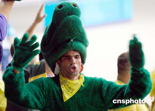北京时间8月27日凌晨,俄罗斯、巴西女排在雅典奥运会女排半决赛中争夺进入决赛的资格。图为打扮成“大灰狼”的巴西球迷在为本国球队呐喊助威。中新社记者:张炜
