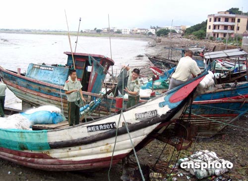 今年第18号台风“艾利”8月25日下午16:30在福建省福清市高山镇登陆后,正在一线抗台风的福清边防官兵迅速转入紧急救灾,为群众挽回经济损失200多万元人民币,确保了省委省政府提出的不死人、少损失的要求,受到当局和群众的一致好评。图为桥尾边防派出所官兵协助当地群众加固渔船。作者:朱明海