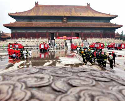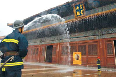 故宫消防中队出动两名抢险员,抢救被烧物资,同时府右街消防中队派出两副担架,从殿内“火海”中救出两名“伤员”。花市消防中队的数名消防员,在殿内架起两节梯,从内部灭火。