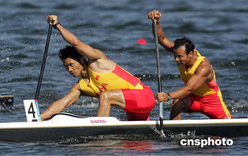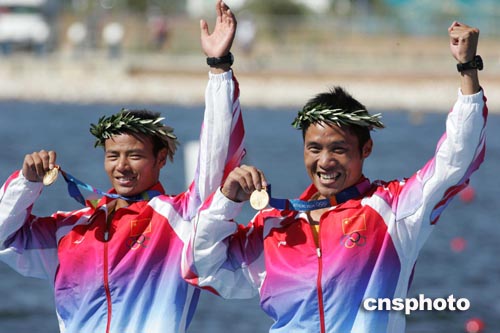 中新社雅典八月二十八日电 中国选手孟关良/杨文军在刚刚结束的奥运会男子五百米双人划艇比赛中,以一分四十秒二七八的成绩夺得金牌。这是中国选手在皮划艇项目上的首枚奥运金牌、中国代表团本届奥运会的第二十八枚金牌。