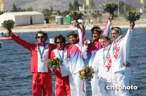 当地时间八月二十八日,中国选手孟关良、杨文军在雅典奥运男子五百米双人划艇比赛中夺得金牌。中新社记者:毛建军