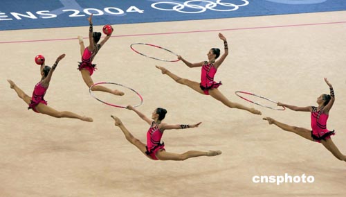 来自辽宁、广东、四川和浙江的六名选手代表中国参加了本届奥运会艺术体操团体项目的比赛。今天的决赛中,中国姑娘凭借较为正常的发挥首轮获得二十三点一的分数,而上届冠军俄罗斯队则以绝对实力首轮以二十五点三分暂列榜首。