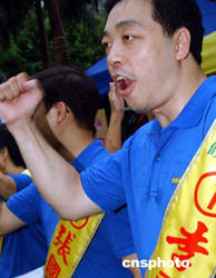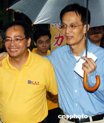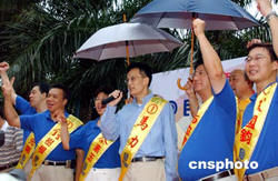 八月二十九日,香港民建联举行2004立法会选举誓师大会,刚刚手术出院的民建联主席马力与港岛区候选人一起在誓师大会上,为进军2004立法会选举造势。作者:钱兴强