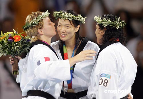 当地时间八月二十九日,中国选手陈中在雅典奥运女子六十七公斤以上级跆拳道决赛中战胜法国选手获得冠军。中新社记者:毛建军