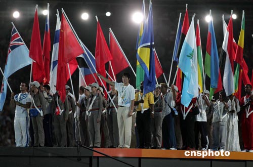 雅典当地时间八月二十九日晚,雅典奥运会闭幕式在奥林匹克主体育场隆重举行,在本届奥运会夺得男子110米栏金牌的中国飞人作为中国体育代表团旗手,步入会场。中新社记者:毛建军