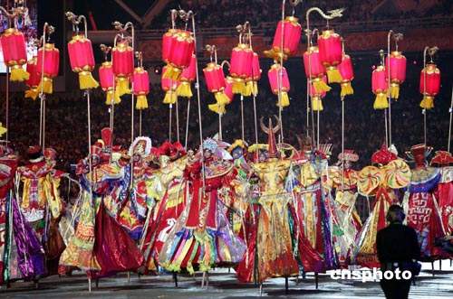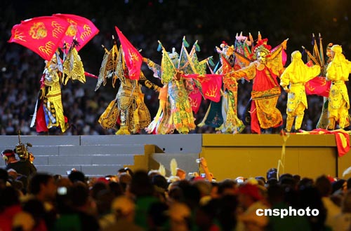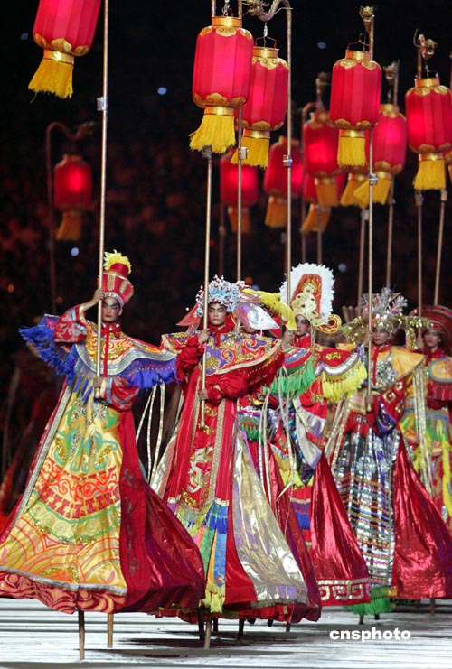 图为中国演员在闭幕式上表演,宣传将于二00八年在北京举行的下一届奥运会。