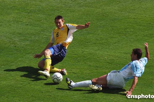 在当地时间28日进行的奥运会男子足球决赛中,阿根廷队以1-0击败巴拉圭,获得冠军。图为Cristian Gonzalez与Edgar Barreto激烈拼抢的镜头。