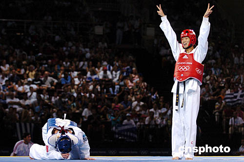 图为在当地时间8月29日举行的女子67公斤级的跆拳道比赛中,中国选手陈中击败法国选手为中国队夺得第32枚金牌。