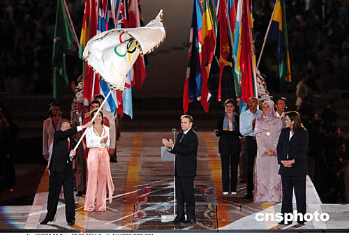 图为北京市长王岐山从奥委会主席罗格手中接过奥运会旗,欢迎大家2008年到北京来。