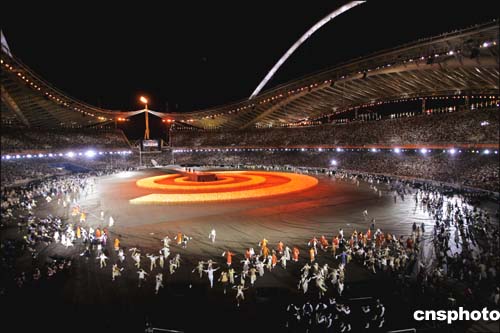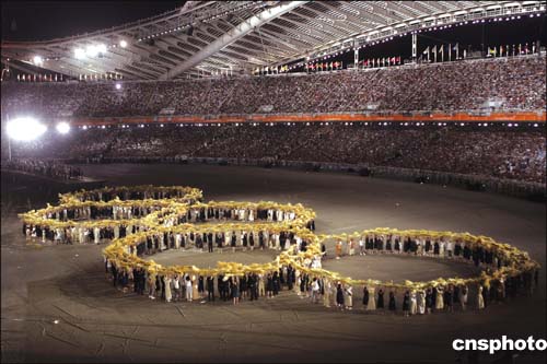 图为雅典奥运会闭幕式上演员们摆出的各种造型。