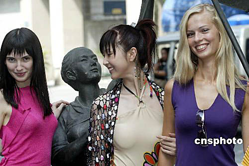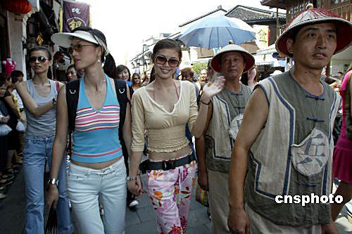| 8月30日,参加2004年新丝路世界模特大赛的二十九个国家和地区的四十多名选手齐聚浙江省杭州市,开始她们的时尚杭州之旅,大赛组委会组织参赛佳丽们游览西湖、乘船沿运河观光,逛杭州著名的河仿街和丝绸城,夜晚竹海漂流,使模特们进一步贴近杭州,贴近市民生活。大赛决赛将与9月5日在杭州举行。中新社记者 盛佳鹏 摄