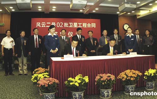 中国国防科学技术工业委员会八月三十一日在北京组织举行“‘风云二号’零二批卫星工程合同签字仪式”,在二零一零年之前,中国将用三发“长征三号甲”运载火箭发射的三颗气象卫星。据称,这是中国民用航天领域首次签署的业务卫星研制生产合同。作者:董东