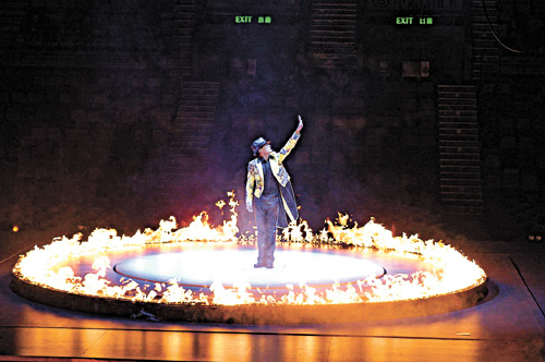 华仔前晚的个唱以爆发大型火圈作揭幕,他站在升高的舞台上,举手点起舞台之火;红馆立时出现一个直径廿一尺之大火圈,把他团团围着,他就在这个大火圈之中,配合舞台机关,突然现身又突然隐形,有如大卫高柏飞般表演魔法。而华仔在红馆所引发的舞台圣火,同时是“红馆”有史以来燃点最大的火特技,为了引发这一场效果,他个多月前亲身到清水舞台日本基地试火;舞台运来香港后,也经过红馆多番审核,由引火的石油气到表演时控制火势大小,都要通过测试,大会一共经过三次试火,才获批准表演。而舞台下面亦藏有多罐石油气体作燃料,“红馆”十分担心安全问题,下令这个项目必定要在开幕进行,免得演唱会两个多小时内台底存放过多易燃物品,表演一旦完成,台底的石油气罐要马上由工作人员移走到安全地点,免生意外。