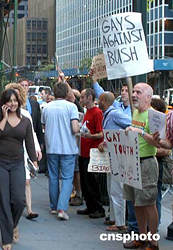 美东时间九月一日中午,纽约一百多名同性恋者聚集在共和党代表准备就餐的餐厅门口,打着“同性恋者反布什”的标语牌,抗议布什竞选连任总统。年初起,布什不断主张禁止同性婚姻。作者:龚文谟