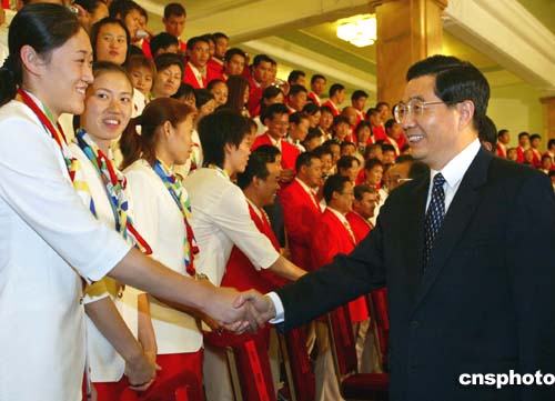 九月二日,中国国家主席胡锦涛等党和国家领导人在北京人民大会堂接见了刚刚从雅典归来的中国体育代表团全体成员、后勤工作人员及参与报道工作的新闻工作者代表。中新社记者:郑萍萍