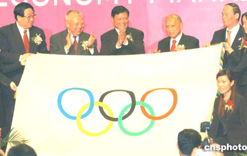 第八届北京香港经济合作研讨洽谈会暨奥运经济市场推介会9月2日在香港会展中心开幕﹐北京市市委书记刘淇与市长王歧山﹑全国政协副主席霍英东﹑香港特首董建华﹑香港中联办主任高祀仁共同打开2008年在北京举办的第29届奥林匹克运动会会旗。作者:赵振清