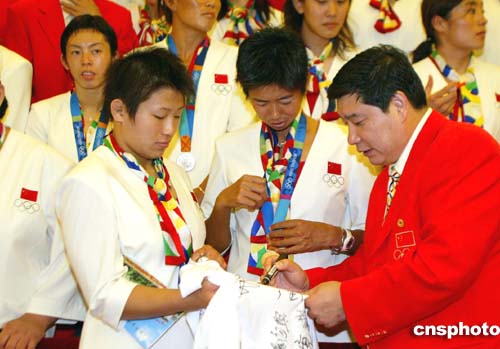 九月二日,第二十八届奥运会中国体育代表团表彰大会在北京人民大会堂举行,同为奥运冠军的小将王旭、李婷向前辈王义夫求取签名。中新社记者:郑萍萍