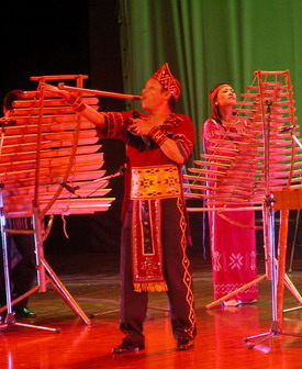 竹制乐器的演奏是越南艺术表演中独具特色的,竹琴据介绍是仿钢琴制成的,音色清脆,节奏明快,表演者的双手在竹键上弹奏,速度快得让观众眼花缭乱;德朗琴是用线将长短不一的竹筒自上而下排挂在一个琴架上,敲击琴筒的两根细棒顶端各固定一个圆球,球上罩着一层布,敲击竹筒时琴声似幽谷回响;klong put琴由一排粗细有别的竹筒制成,演奏者根据每个竹筒的固定音调,用手在筒端变换敲击出舒缓绵长的曲调来;还有一个孔的箫,远远看去吹萧人将萧横托在面前,用手在萧的远端一开一合地掌握音阶,仿佛中国萧从小孔开合变换里发出的声音,都从越南吹萧人的手中魔幻般地变了出来。这些乐器既有独奏,又有合奏,兼有表演的观赏与听觉的双重效果,极具艺术魅力。
