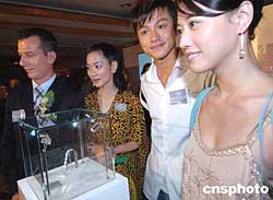 瑞士名表MILUS九月三日在香港举行发布会,展示其价值高达99万的TARASEA钻石腕表。图为影星、著名设计师等出席揭幕仪式。作者:钱兴强