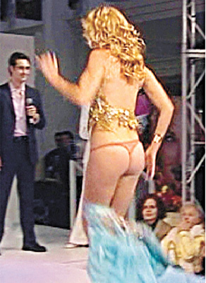 据悉,霍金斯当时正在展示重15磅的金属纤维镶边裙,她所穿的高跟鞋踩到裙脚,令她的长裙应声倒地,露出红色性感T-back内衣。