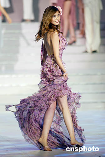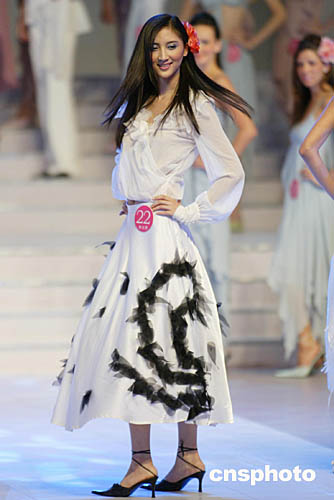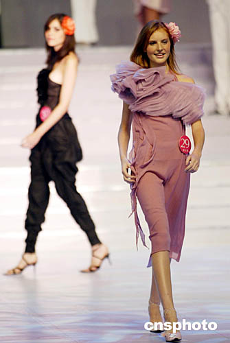 9月5日晚,“时尚杭州之旅·2004年新丝路世界模特大赛”在浙江省人民大会堂举行,来自二十八个国家的四十七名选手将参加小礼服、泳装、晚装展示、情景剧表演以及系列专业技能展示的比赛。中新社记者:盛佳鹏