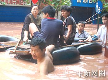 图为受灾群众用数个轮胎连在一起撤离灾区。作者:邱垡鑫