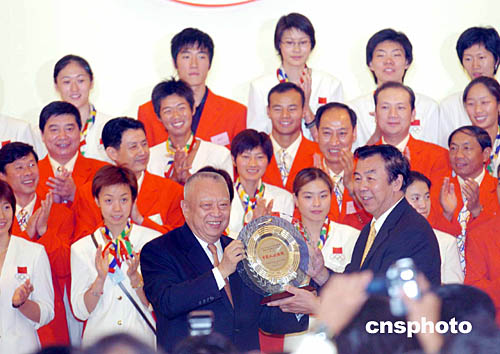 9月6日,香港特区行政长官董建华在礼宾府举行盛大欢迎酒会上,向中国奥运金牌选手访港团赠送“中国人的骄傲”礼物。