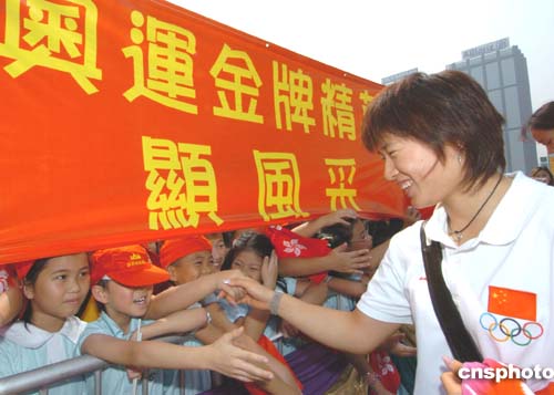 国家奥运金牌代表团9月7日在香港展开观光访问,穿运动套装的金牌选手乘坐旅游小巴抵达金紫荆广场参观,随即绕场一周与市民握手和签名。图为金牌选手罗雪娟与市民亲密接触。作者:赵振清