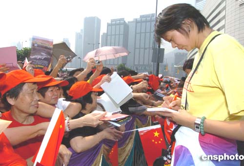 国家奥运金牌代表团9月7日在香港展开观光之旅,9时45分抵达湾仔金紫荆广场参观,吸引大批市民围观,图为女排选手赵蕊蕊为热情的香港市民签名。作者:赵振清