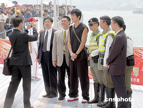 国家奥运金牌代表团9月7日在香港展开观光之旅,金牌选手分别在香港多处名胜景点参观,所到之处均深受广大市民热烈欢迎,其中“栏王”刘翔在尖沙咀星光大道参观,交警也邀请他合照。作者:邓庆乐