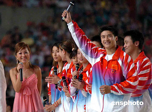“奥运金牌精英大汇演”7日晚上在香港政府大球场举行,全场爆满。图为“跳水王子”田亮向在场举手致意。作者:洪少葵
