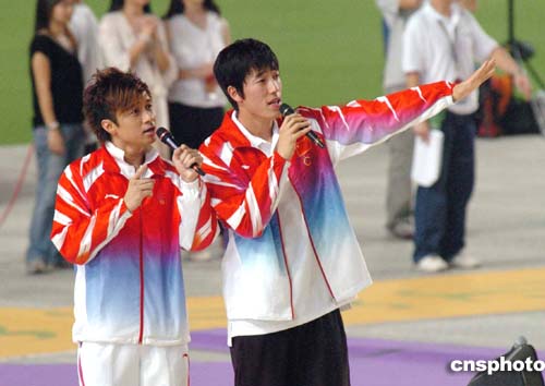 图:古巨基与刘翔在精英大汇演上高歌
