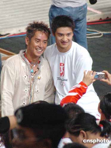万众瞩目的“奥运精英大汇演”7日晚上在香港大球场举行,国家奥运金牌选手和数万名香港市民会聚在此,共享中国在雅典奥运会夺金的喜悦和荣光。图为金牌选手田亮邀请演出嘉宾谭咏麟合影。作者:洪少葵