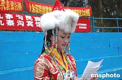 世界遗产四川九寨沟山灵水秀,这里的藏族姑娘如同山水一样美丽动人。一位藏族姑娘正盛装致辞欢迎远道而来的游客。中新社记者:田地