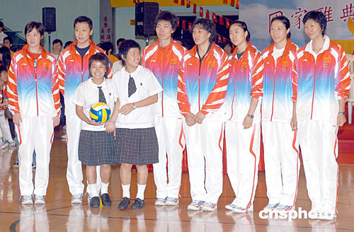 国家奥运金牌代表团9月8日在香港与中学生运动交流,并举行抽奖活动,中国女排部份队员向获奖学生致送签名排球及合照。作者:邓庆乐