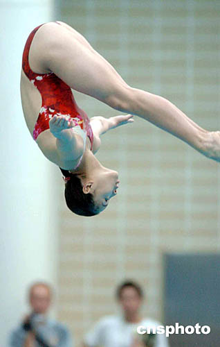 国家奥运金牌选手9月8日在香港进行最后一天访问行程,与市民亲密接触。图为跳水名将吴敏霞表演高台跳水。作者:洪少葵