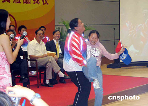 十多名中国奥运金牌运动员8日到香港中文大学访问,七百多名师生出席欢迎活动。期间有学生要求女子75公斤举重金牌得主唐功红抱起她,引来全场哄动。作者:尹丹丹
