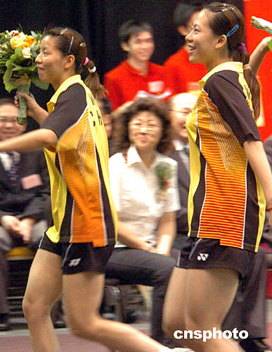 为欢迎国家奥运金牌代表团访港,九月八日香港举行“中国人的骄傲--奥运金牌精英显风采”奥运金牌羽毛球及乒乓球表演。图为奥运羽毛球金牌运动员将鲜花抛向看台观众。中新社记者:钱兴强