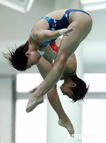 跳水示范表演,首先进行的是三米板单人跳水,由郭晶晶第一个出场。郭晶晶向前快走了几步,弹得很高,向前屈体,然后入水,水花压得很小。随后,吴敏霞、彭勃、杨景辉也亮出看家本领。全场对运动员的表演赞叹不已,掌声不断。