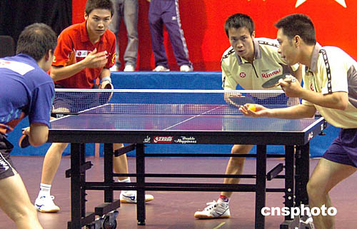 为欢迎国家奥运金牌代表团访港,九月八日香港举行“中国人的骄傲--奥运金牌精英显风采”奥运金牌羽毛球及乒乓球表演。图为奥运乒乓球男子双打金牌得主马林、陈杞与银牌得主香港的李静、高礼泽进行混合友谊赛。中新社记者:钱兴强