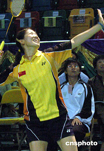 为欢迎国家奥运金牌代表团访港,九月八日香港举行“中国人的骄傲--奥运金牌精英显风采”奥运金牌羽毛球及乒乓球表演。图为奥运羽毛球金牌运动员为观众进行示范表演。作者:钱兴强