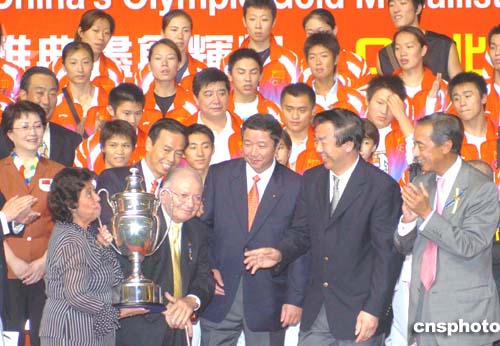 马会搭设的颁奖台上,写有“0四雅典尽创辉煌,0八北京再显锋芒”的字样,表达了马会的愿望。代表团团长、国家体育总局局长袁伟民颁发了奖杯,而全体金牌运动员则登上颁奖台,列席颁奖仪式。在此之前,全体金牌运动员还在一匹骏马雕塑上签名留念。