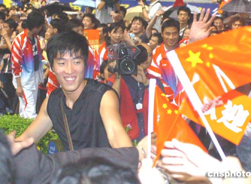 今天晚上的跑马地马场,吸引了超过三万的观众。马迷们热情洋溢,挥动着国旗及写有“欢迎”字样的条幅,迎接中国奥运金牌得主的到来。很多郭晶晶、田亮的FANS,更是把亮晶晶的名字写得大大的,亮亮的,格外引人注目。当代表团一行走进马场,顿时爆发出热烈的欢呼声。人们喊着各自喜爱的运动员的名字,气氛极尽炽热。