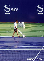 九月九日,工作人员在北京网球中心中央球场进行最后的准备工作。目标为世界第五大网球赛事的中国网球公开赛将于十日开幕,包括费雷罗、莫亚、萨芬、小威廉姆斯、莎拉波娃、李婷、孙甜甜等在内的中外网球名将将参加为期十七天的比赛。中新社记者:武仲林