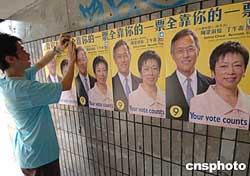 香港2004立法会选举前夕,各地区立法会候选人进行最后拉票活动,图为在新界西选区候选人抓紧时间最后张贴海报宣传造势。作者:钱兴强