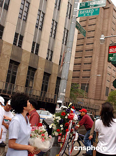 在距离世贸废墟仅仅几个街区的华埠,人们怀念着一位华裔“九一一”英雄曾喆。曾喆不在世贸大楼工作,他是在自发前往“九一一”现场救护他人时牺牲的。由于不能及时确认遗骨,他的葬礼在“九一一”一周年时才举行。三年过去了,人们没有忘记他。今天,华埠的一条街道正式以曾喆的名字命名。这是“九一一”后纽约首个以亚裔“九一一”英雄名字命名的街道。