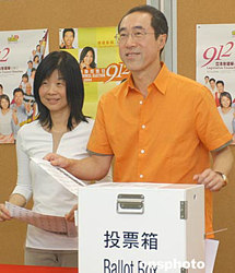 9月12日为香港第三届立法会选举投票日,香港财政司司长唐英年偕同夫人在港岛香港仔陈白沙纪念中学投票站投票。作者:邓庆乐