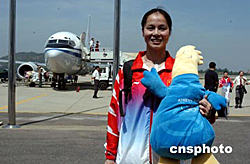 在第二十八届雅典奥运会上夺得女子蹦床铜牌的闽籍运动员黄珊汕,九月十三日携雅典吉祥物载誉返闽抵达福州长乐国际机场时,受到福建省各界人士的热烈欢迎。作者:刘可耕