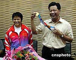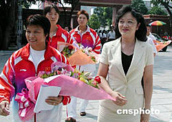第二十八届雅典奥运会女子柔道五十二公斤级冠军冼东妹的家乡——广东肇庆,九月十三日下午举行盛大的欢迎仪式,并以六十万元人民币重奖自己的优秀女儿冼东妹。图为肇庆市副市长黄玲陪同冼东妹步入会场。据悉,肇庆市委、市人民政府授予冼东妹肇庆市劳动模范、“三八”红旗手、“肇庆市杰出青年”等荣誉称号。同时,四会授予她四会市劳动模范、四会“三八”红旗手、“四会市杰出青年标兵”等称号;四会石艺国际集团赠送一套高级公寓给冼东妹。作者:黄耀辉