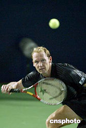 九月十三日,在北京网球中心中央球场举行的中国网球公开赛男子单打比赛中,ATP巡回赛排名第二十五位的德国网球名将舒特勒,以二比零战胜澳大利亚选手巴卡尼罗,顺利晋级下一轮比赛。图为舒特勒在比赛中。中新社记者:盛佳鹏